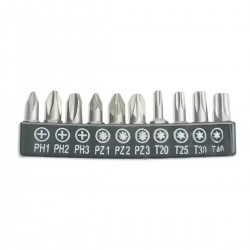 Bitu tips: SL3, SL4, SL5, SL6; PH1, PH2, PH3; PZ1, PZ2, PZ3; H4, H5, H6; T10, T15; ligzdas: 4, 4,5, 5, 5,5, 6, 7, 8, 9, 10, 11, 12, 13, 14; roktura izmērs: 1/4\"; bitu garums: 25 mm; tērauda tips: S2..